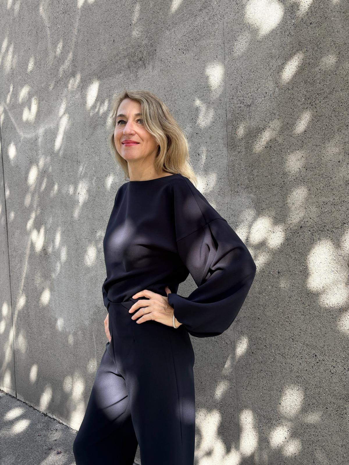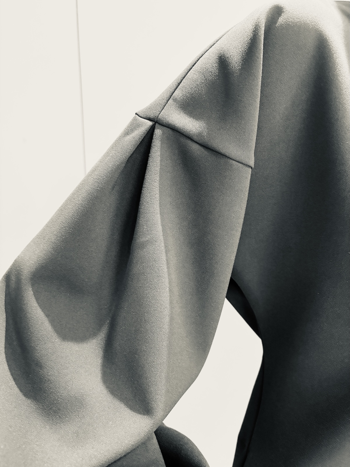 Tailliertes Fliessendes Oberteil, Langarm mit leicht angezogenem Gummizug. Der Schlitz in der hinteren Mitte, setzt einen besonderen Akzent.