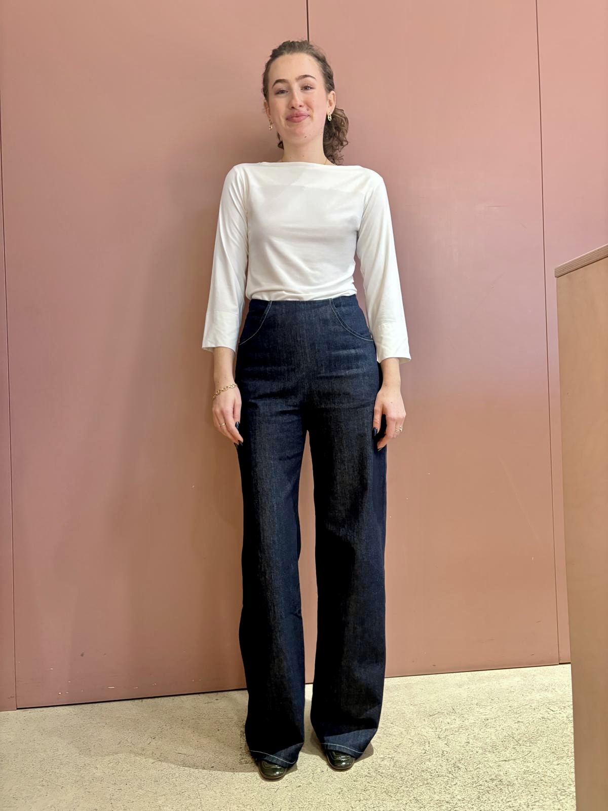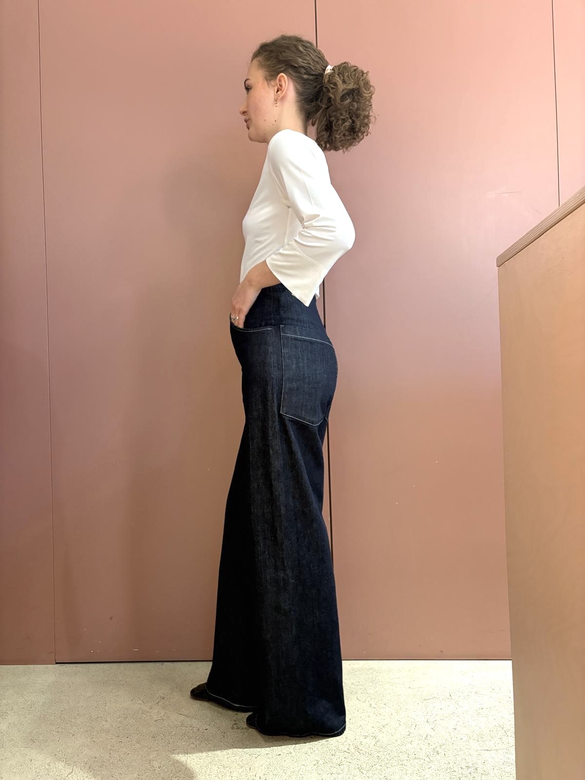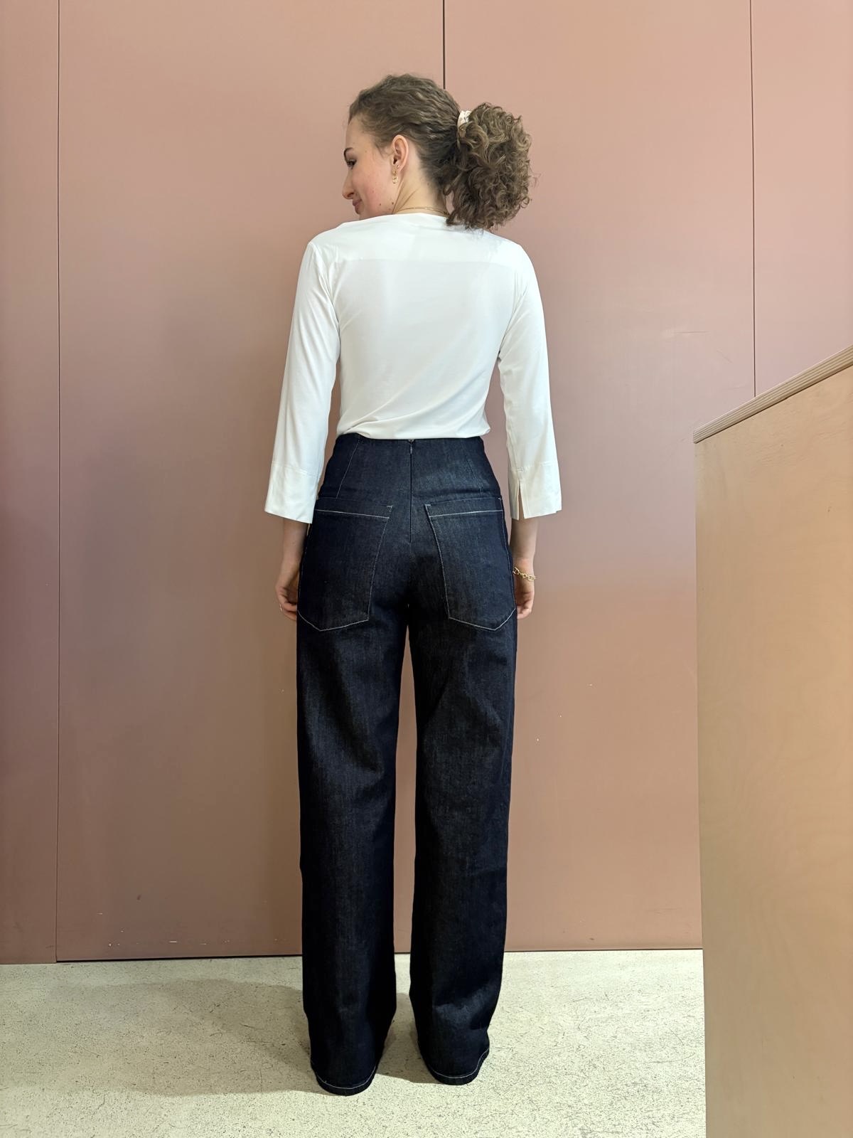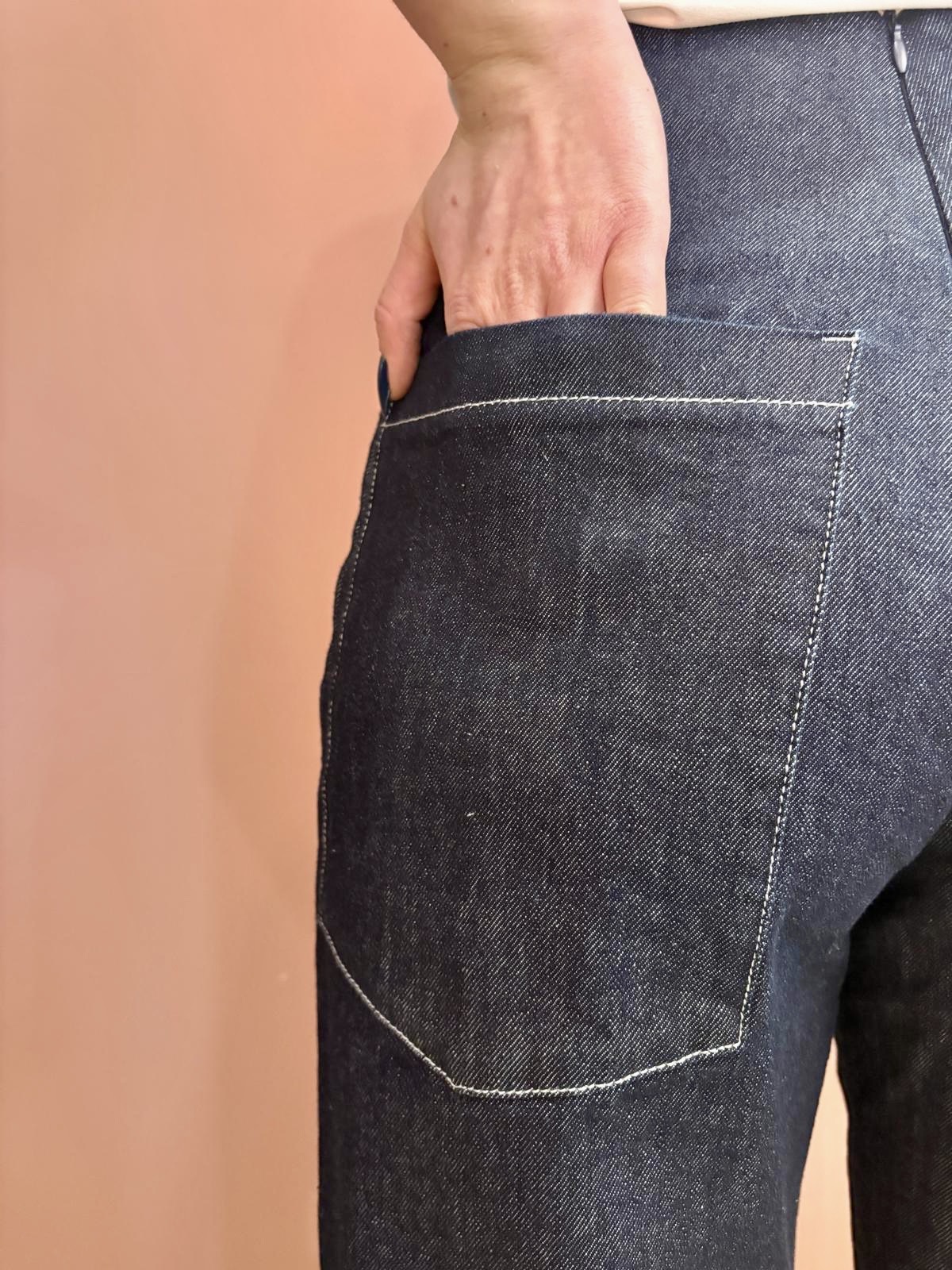 Jeans mit nahtverdecktem Reissverschluss hinten. Vorne mit Eingriffstaschen, hinten mit aufgesetzten Taschen. Die Taille ist schmal geschnitten, der Saum weit und kann aufgeschlagen werden.