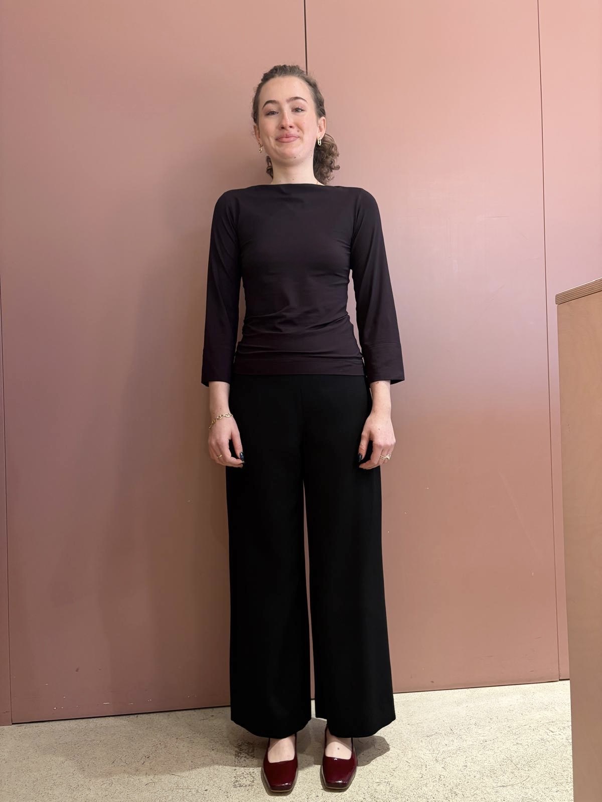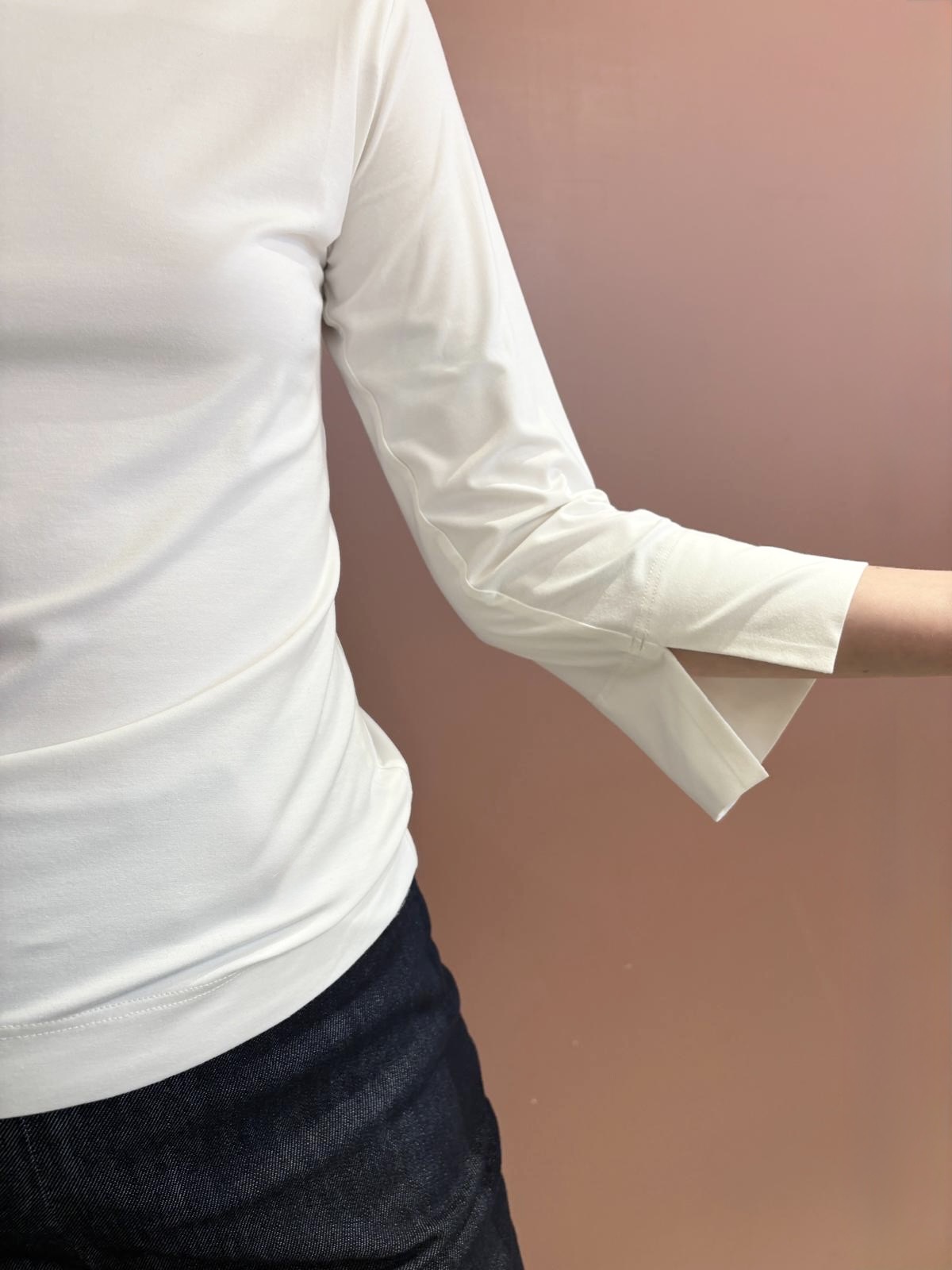 Das Jersey-Shirt ist anliegend geschnitten und hat Dreiviertelärmel mit einem kleinen Schlitz sowie einen Schiffli-Ausschnitt. Ein schönes, spezielles Basic.