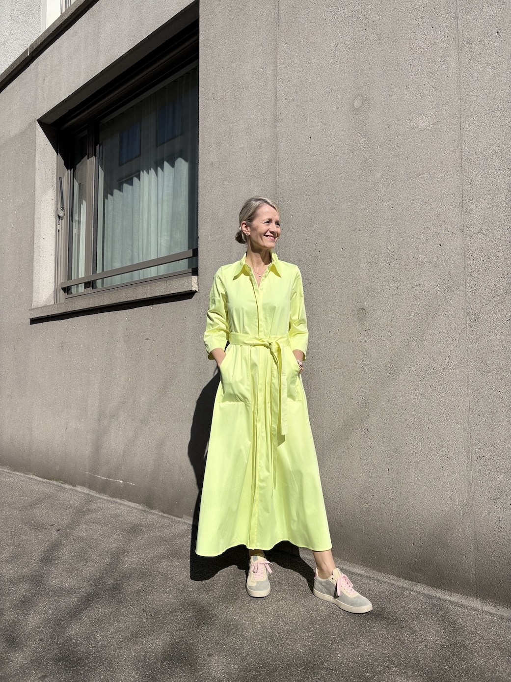 Weit geschnittenes, sommerliches Kleid mit klassischem Kragen und verdeckter Knopfleiste. Aufgesetzte Fronttaschen und Dreiviertelärmel ergänzen das Design. Der Gürtel kann die Taille akzentuieren oder weggelassen werden, für eine locker fallende Silhouette.